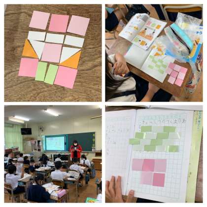 2年生の算数では、色紙を並べていろいろな模様をつくっています。