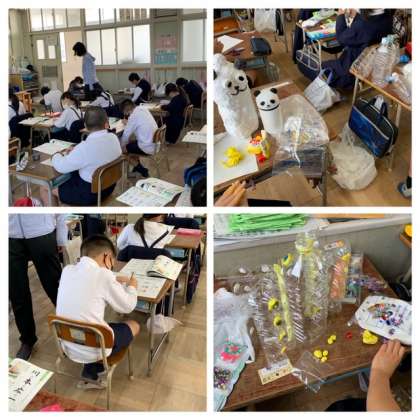 3年生の図画工作では、ペットボトルや紙粘土を使ってふしぎな生き物を作っています。