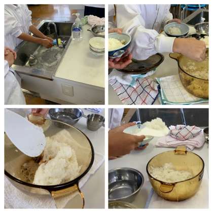 5年生が調理実習でごはんを炊いています。炊きあがっていくようすが観察できます。おこげがついておいしそうです。