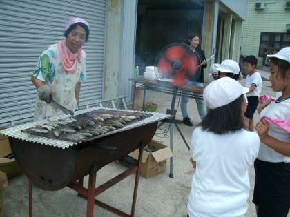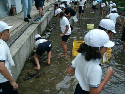 魚つかみに挑戦!すばしっこくてヌルヌルしているので悪戦苦闘。獲れたアマゴは焼いていただいて食べました。普段あまり魚を食べない子どもも、「おいしい!」と骨まで食べていました。