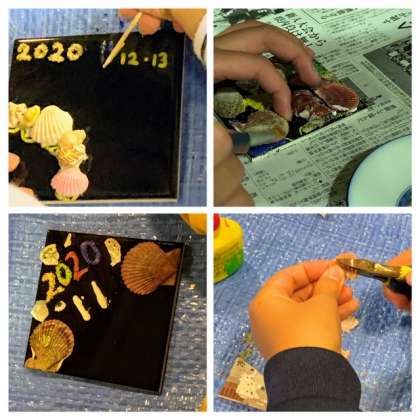 ボンドや貝殻を使って装飾しています。