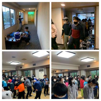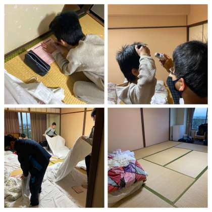 コロナ感染者が急増しており、この修学旅行でもバスの窓を開けての換気、部屋の換気、就寝時の頭の位置など、対策をしております。