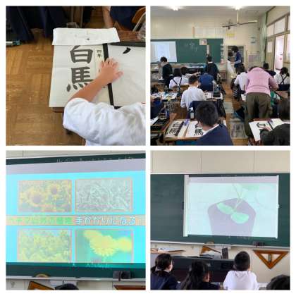 4年生が書写に取り組んでいます。また、理科では、春に種をまいた植物は、秋になるとどのように成長しているのか映像も見ながら確かめています。