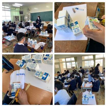 図画工作では、トロトロ、カチカチワールドで牛乳パックを使って土台作りをしています。