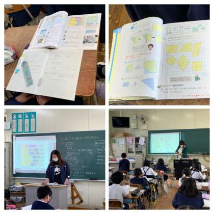 2年生の算数では、同じ数のまとまりに目をつけて、かけ算を使って考えています。また、長方形から作った四角形の角の形や辺の長さを調べています。