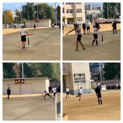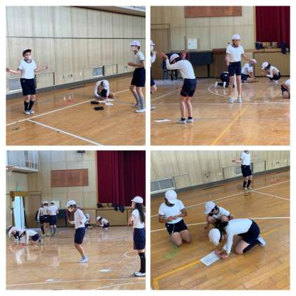6年生の体育では、Tボールのゲームをしています。講堂では、チャレンジなわとびカードを使ってなわとびの技に挑戦しています。