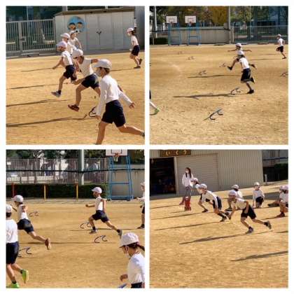 3年生がミニハードルをリズムよく越えて走っています。
