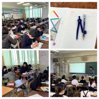 算数では、コンパスを使って2等辺三角形をかいています。