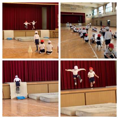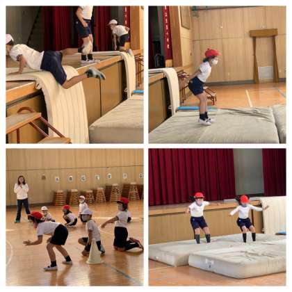 1年生の体育では、マットや踏み切り板を使って這い上がったり、飛び降りたりしています。