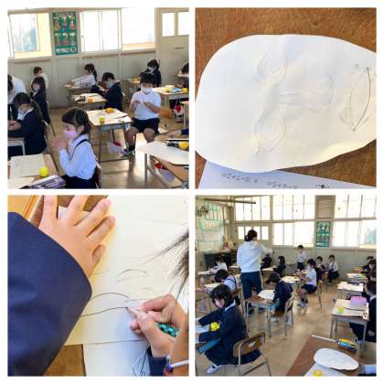 1年生の図画工作では、顔のまゆをかいて貼り付けています。