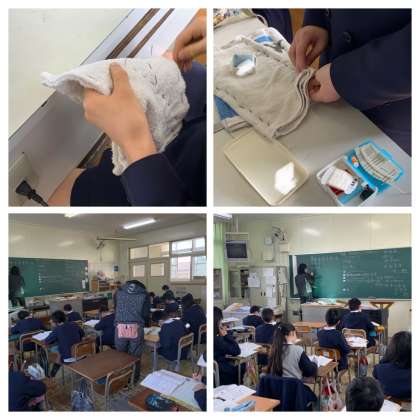 6年生の家庭科では、在校生へのプレゼントに雑巾を縫っています。
