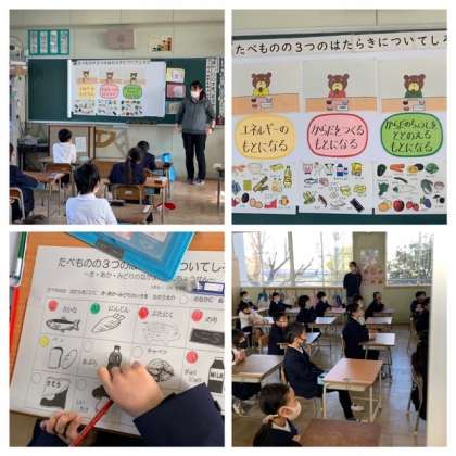 1年生が栄養指導を受けています。食べ物の3つのはたらきについて学習しています。
