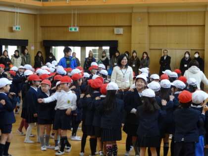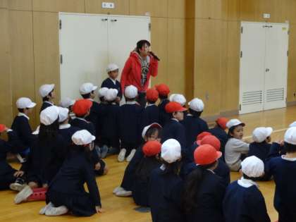 姫島小学校、福小学校の1年生といっしょに、「ジャンケン列車」「ようかいなかまゲーム」「ふえおに」をして遊びました。