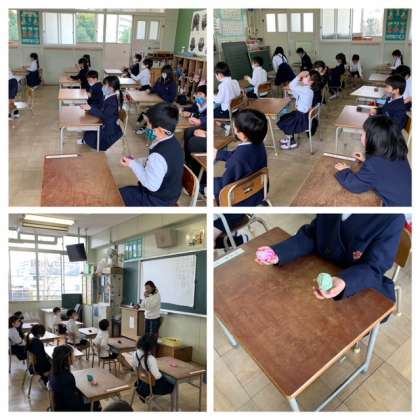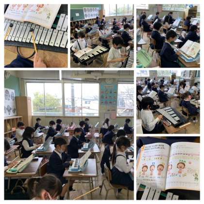 1年生が楽器を交替しながら合奏したり、お手玉に挑戦したりしています。
