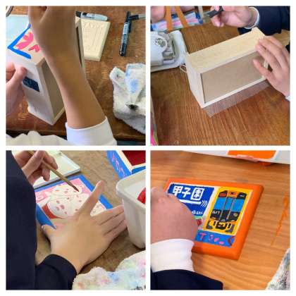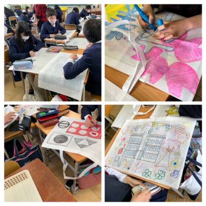 6年生の図画工作では、作品袋に思い出の絵をかいたり、メモリアルボックスを製作したりしています。