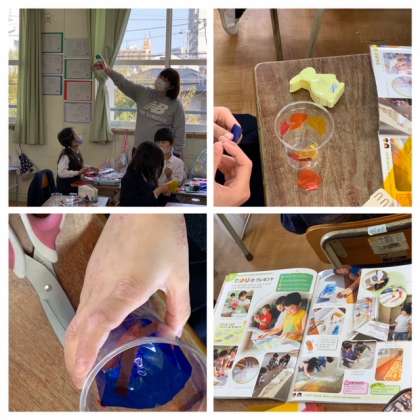 2年生の図画工作では、「ひかりのプレゼント」で、いろいろな物に光を通してどんな形や色が見えるか試しています。