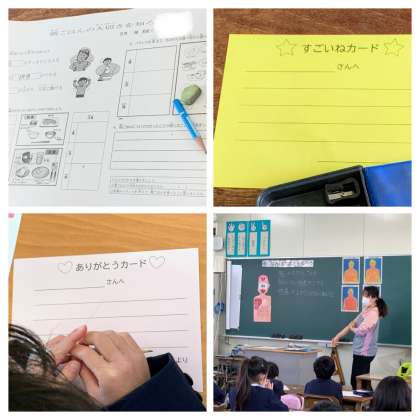 1年生が「ありがとうカード」や「すごいねカード」を書いて友だちに渡しています。