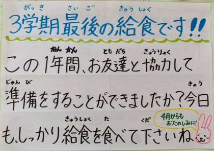 1年間おいしい給食を作ってくださった給食調理員さん、ありがとうございました。