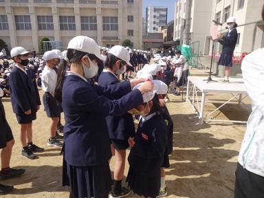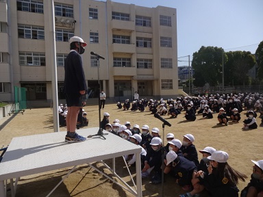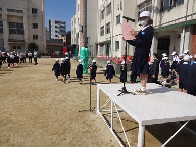 4月15日(水)朝から児童集会で「1年生よろしくね集会」を代表委員会の児童が中心になって運動場で行いました。2年生以上の児童が音楽に合わせて拍手する中、81名の1年生が入場しました。児童代表の歓迎の言葉のあと、6年生が作ったメダルを一人ずつ1年生の児童にプレゼントしました。