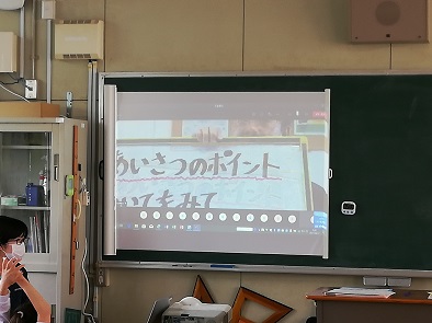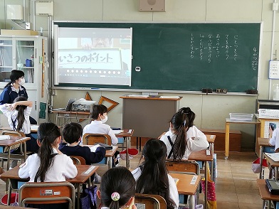 あいさつについて、どんなふうにしているか振り返り、あいさつのポイントを話しました。「あいてをみて」「えがおで」「きこえるこえで」「すすんで」の4つです。あいさつは、人と人の心をつなぐ魔法の言葉です。「自分から進んで笑顔でできるようがんばりましょう」と言いました。