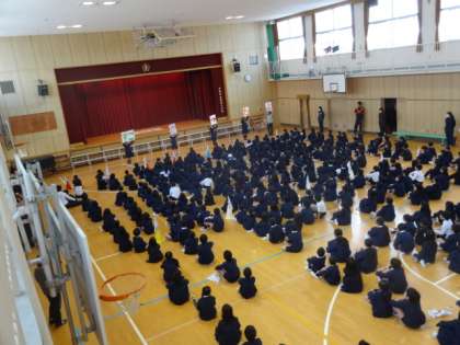 児童集会では、1年生から5年生があつまって「6年生卒業お祝い集会」の練習をしました。