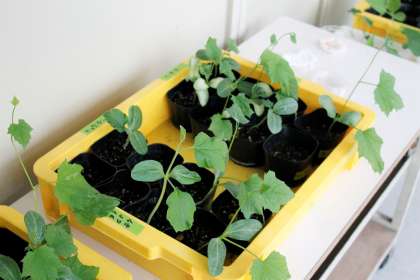 理科室前で育てているヘチマとヒョウタンのなえが,どんどん大きくなってきています。