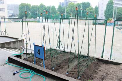 土をたがやして,つるのまきつける支柱のかわりとしてネットをはりました。