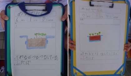 先日植木鉢に蒔いたたねが芽を出し、双葉が開いています。その様子をカードに丁寧に記録していました。