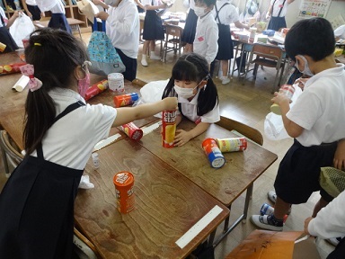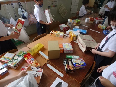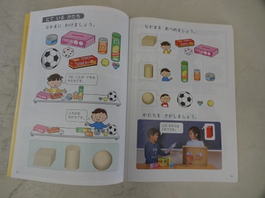 1年生が算数科の学習「にているかたち」に取り組んでいました。家から持ってきた様々な形の箱を、「しかくいかたち」や「つつがたのかたち」など似ている形で種類分けしていました。