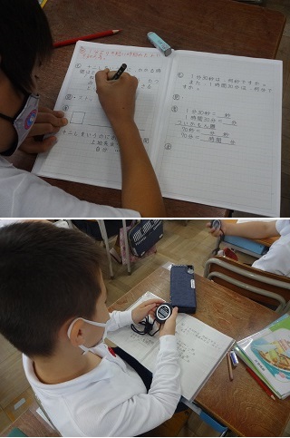 算数科「時こくと時間」の研究授業が3年生でありました。1分より短い「秒」の意味を理解し、いろいろな時刻や時間の求め方を考えたり説明したりすることがねらいでした。