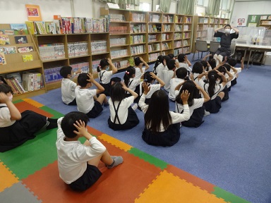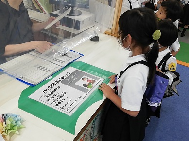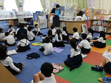 1年生が、図書館補助員の方から図書室の使い方や本の借り方を教わっていました。