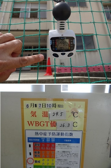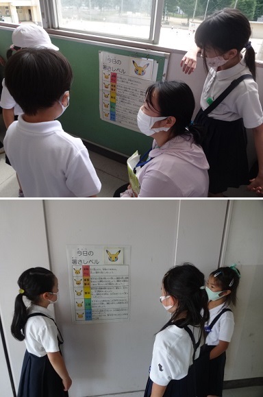 6月7日(月)午前10時30分と午後1時に気温と湿度をもとに暑さ指数(WBGT値)を計測し、熱中症の危険度を5段階のピカチュウの絵で子どもたちに知らせるようにしました。今日は「警戒(積極的に休息)」でした。