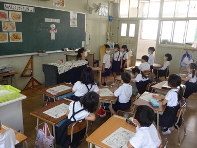 1年生が栄養教諭の先生と、おいしい給食がどのように作られているかのお勉強をしていました。給食室で使われている『木かい』との背比べでは、大きさに驚いていました。