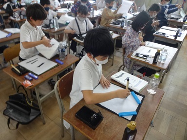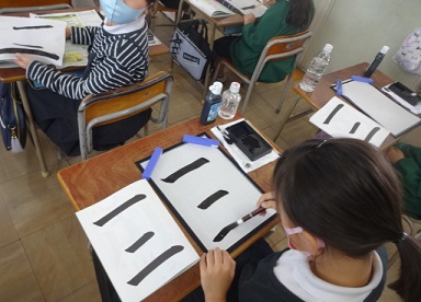 6月18日(金)3年生が書写「一二」の学習をしていました。毛筆の基本となる横画の書き方について練習をしていました。お手本をよく見て、ていねいに書いていました。