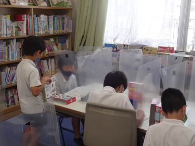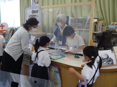 6月21日(月)2時間目と3時間目の間の休けい時間に、どんぐり(図書館ボランティア)の方に来てもらい、本の貸出・返却などが行われていました。