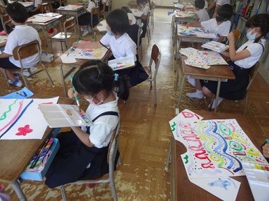 6月21日(月)2年生が図画工作科で「こんなTシャツをきてみたいな」の学習をしていました。絵の具を使って、自分が着てみたいTシャツのデザインを絵で描いていました。夏らしい爽やかな模様がたくさんできていました。
