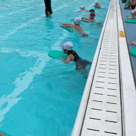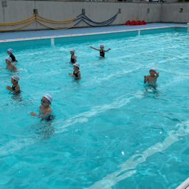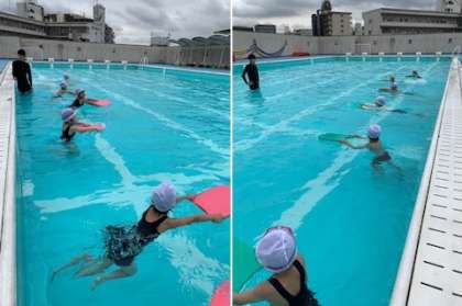7月2日(金)1年1組の子どもたちがプールで「みずあそび」をしました。プールの中で音楽に合わせてダンスをしたり、水中を歩いたり、ビート板を使ってバタ足をしたりしました。その後、水に沈んだ宝物を潜って取ったりしました。