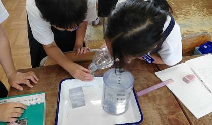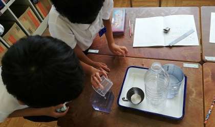 7月2日(金)の2時間目、2年生が教室で算数の授業をしていました。班のみんなでペットボトルの水をメモリのついた容器や丸いカップ、小さな容器などに注いで、班のみんなでいろいろな容器に入れて、水の量をどう表すことが出来るかを考えていました。