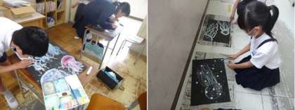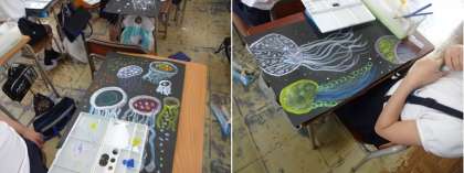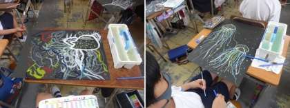 5年生が図画工作科の学習で「たゆたうクラゲ」の絵を描いていました。