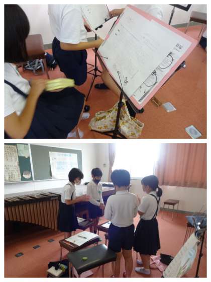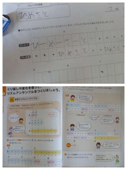 4年生がグループで4文字のことばを使ったリズムアンサンブルを作っています。今日は、どんな4文字の言葉を使うかを決めて、その言葉の組み合わせを考えました。組み合わせの決まったグループは、言葉を言う練習をしています。来週、クラスで発表する予定です。