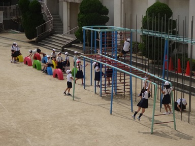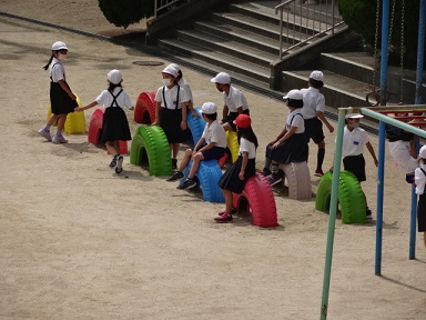 管理作業員さんが運動場にあるタイヤ遊具に色を塗ってくれました。休み時間に子どもたちが楽しそうに遊んでいました。