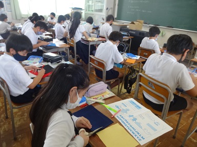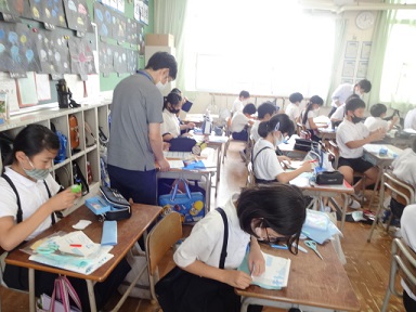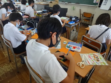 5年生が家庭科「小物づくり」の学習をしていました。フエルトを使って、簡単な小物づくりに取り組み、裁縫の仕方を学んでいました。思っているものができるか楽しみです。