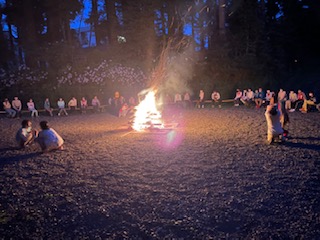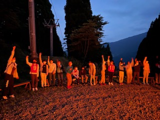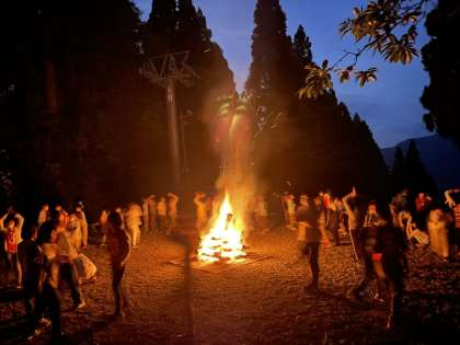 ?日が暮れて、宿舎近くの森の中でキャンプファイヤーをしました。火の周りでゲームを楽しみました。