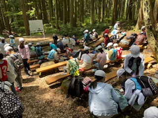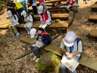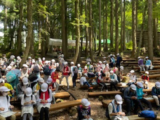 山を下りて、宿舎の前で冷えたジュースをいただきました。そのあと森のステージで木のキーホルダーづくりを楽しみました。