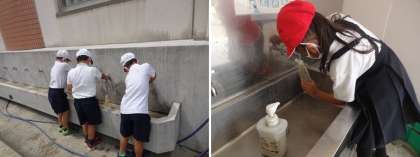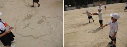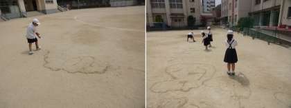 1年生が調味料の空きパックなどをつかって水遊びをしていました。運動場に絵や文字をかいたり、水鉄砲のようにどこまで飛ぶか友達とチャレンジしてみたりと、自分たちで遊び方を考えながら、取り組んでいました。