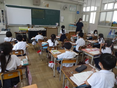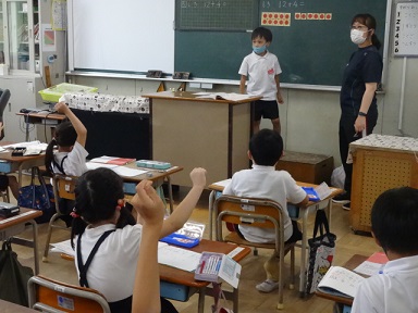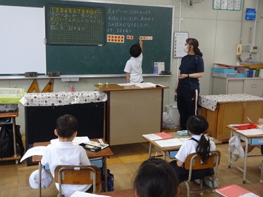 1年生が算数科「たしざん」の学習で12+4の計算の仕方を考えていました。10のまとまりを置いておいて、2+4を先にして後から10のまとまりを合わせる仕方を発表していました。