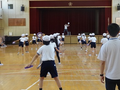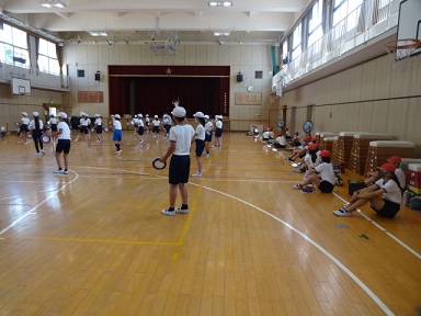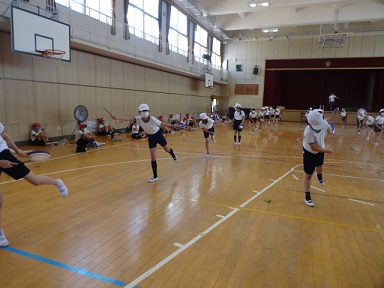 5年生が運動会の団体演技の練習を体育館でしていました。