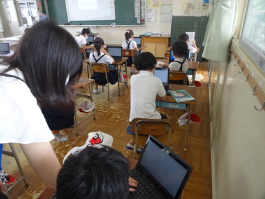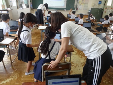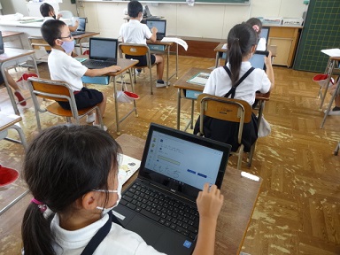 2年生が一人1台の学習端末を活用して、デジタルドリルの学習の練習をしていました。ICT支援員の方にも支援してもらい、楽しく学んでいました。