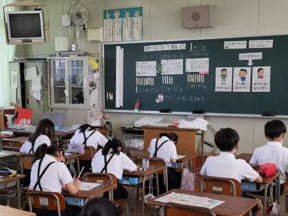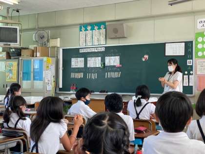 4年生が栄養指導で「おやつについて考えよう」という内容の学習をしていました。普段食べることの多いおやつには砂糖が多く含まれていることや、砂糖の取りすぎによっておこること知り、食べすぎないようにどのようにすればよいかの工夫を考えていました。