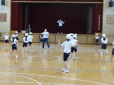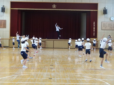 音楽に合わせて、リズミカルにダンスの練習をしていました。1クラスずつ交代で練習しますが、座って見ている子ども達もその場で腕の振りなど一緒に練習していました。